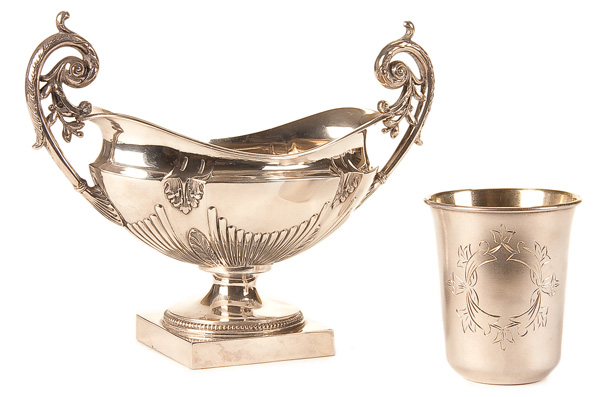 A RUSSIAN SILVER SUGAR BOWL AND BEAKER after 1917, the oval urn shape partially fluted sugar bowl with scrolled foliate handles and indistinguishable 84 hallmark together with an engraved beaker stamped 84 Kiev. Length 7.5 inches (19 cm), height 2.75 inches (7 cm)