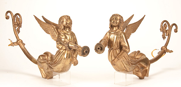 A PAIR OF FRENCH GILT BRONZE FIGURAL ANGEL WALL SCONCES circa 1900, the scrolled wall brackets terminating in full sculpted figures of descending winged angels each with an arm outstretched with a fitting for a lamp. Length 28 inches (71 cm)