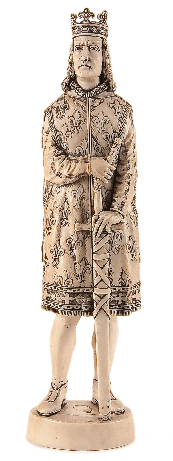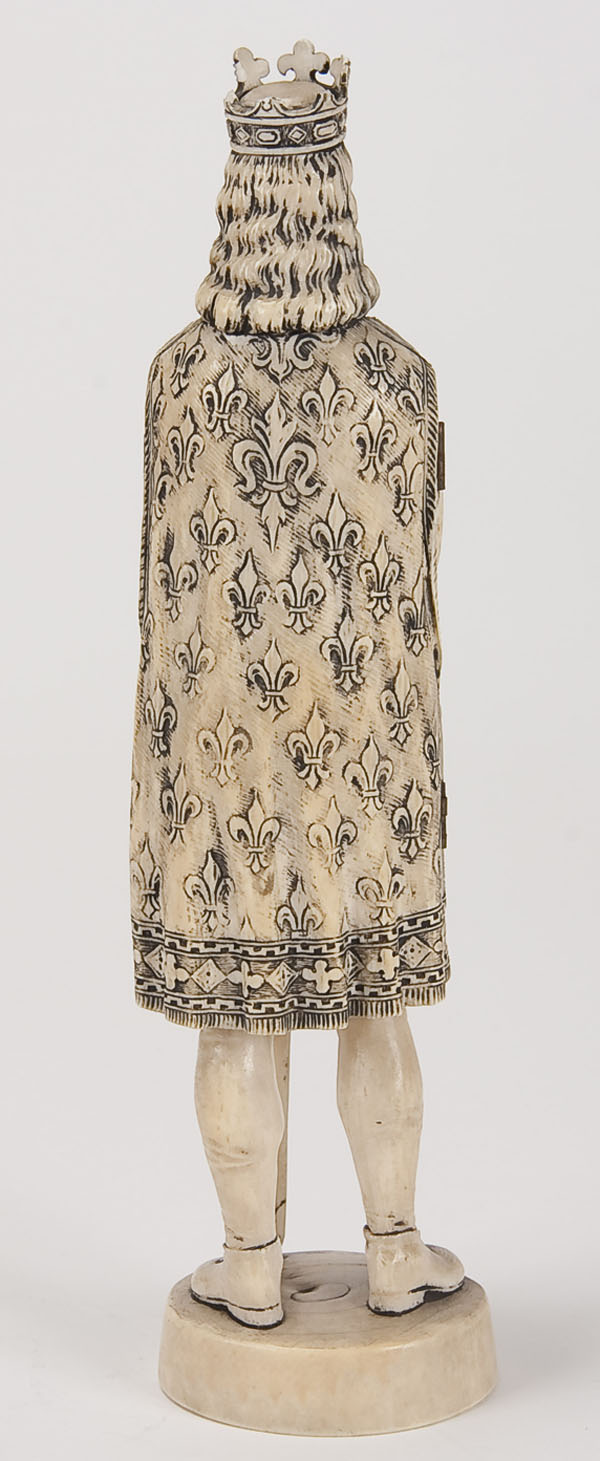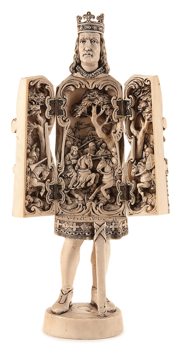 A FRENCH 19TH CENTURY CARVED IVORY TRIPTYCH FIGURE OF 'PRINCE PHILIPPE II'. Finely carved in full round, opening to reveal an intricately carved medieval battle scene. Inscribed 'PRISE de BOVVINES PHILIPPE II'. Some minor losses to crown. Height 10 inches (25.4 cm).
