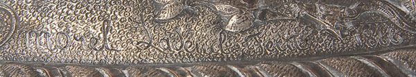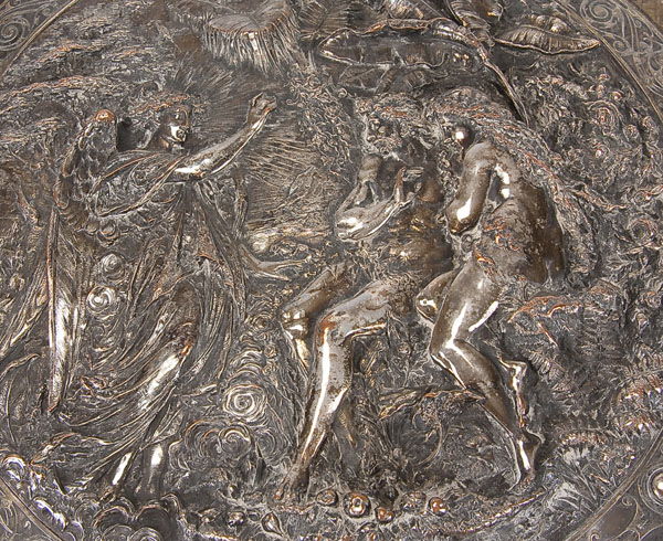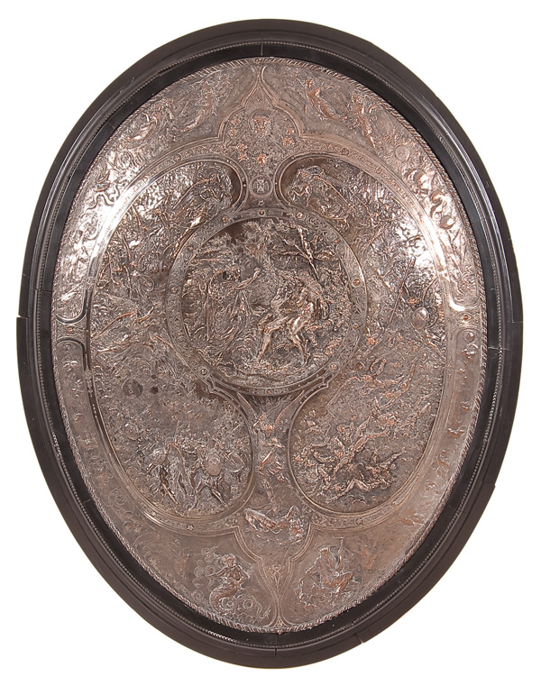 A VICTORIAN PLATED COPPER 'MILTON SHIELD' 19TH CENTURY The silver plated repousse copper shield, of slightly convex oval form with roped border, the central circular panel depicting Adam and Eve addressed by the archangel Raphael, framed on either side with ovoidal panels depicting subjects from Milton's 'Paradise Lost', sixth book, the hosts of Heaven attacking the rebels who are driven out and fall to perdition, St. Michael waving his flaming sword over the dragon who appears in human form, Sin and Death appearing on the base, the border with Zodiac signs symbolizing the rolling year and flight of Time, the upper part of the shield depicting angels and seraphs soaring high above the strife below, flanking the emblem of all Light and Life and encircled by winged cherub's heads, in its original ebonized shaped frame. Inscribed Morel-Ladeuil lower left.38 inches x 31 inches (97 x 79 cm).