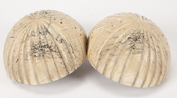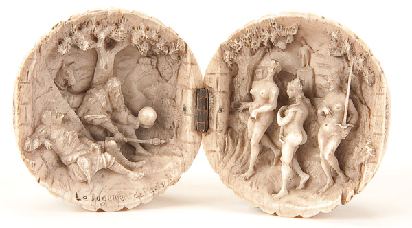 A FRENCH CARVED IVORY DIPTYCH SPHERE, 19TH CENTURY. The hinged clam shell form opening to reveal an intricately carved interior depicting 'The Judgment of Paris' as inscribed. Diameter 2.15 inches x 4.15 inches (5.5 x 10.5 cm) (open).