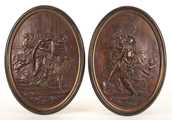 A PAIR OF FRENCH PATINATED SCENIC BRONZE PLAQUES, 19TH CENTURY. Of oval form depicting 'The Rape of the Sabine Women'. Signed lower right 'Coustou'. Height 16 inches (40.5 cm)