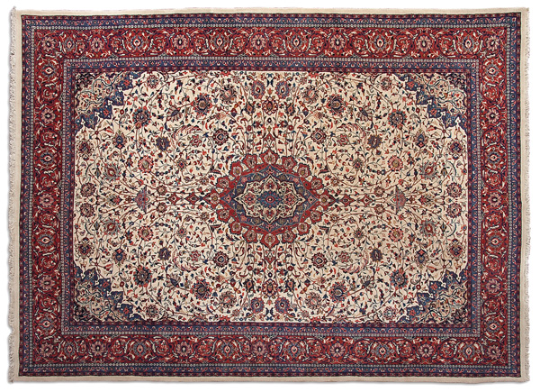 A FINE PALACE SIZE KERMAN ORIENTAL CARPET, MID 20TH CENTURY. Hand woven wool in a finely detailed field of scrolling foliates in red, blue and gold on ivory ground with red border. 13 ft 4 in x 10 ft 5 in