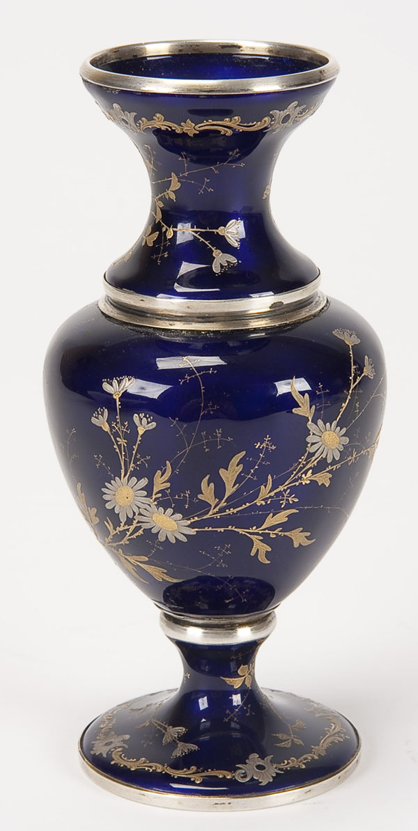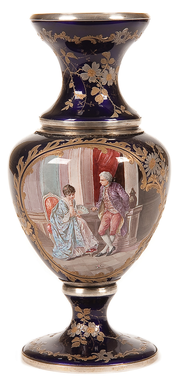 A FINE 19TH CENTURY FRENCH ENAMELED SILVER CABINET VASE. With an expertly enameled scene of a courting couple within a gilt floral and scroll cartouche on a cobalt ground. Signed lower left with 'FC' monogram and stamped hallmarks. Height 6.5 inches (16.5 cm).