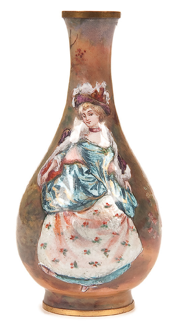A FRENCH ENAMELED GILT BRONZE CABINET VASE, CIRCA 1900. With enameled and silver foil figure of a young beauty. Signed indistinguishably lower right. Height 4.25 inches (11 cm).