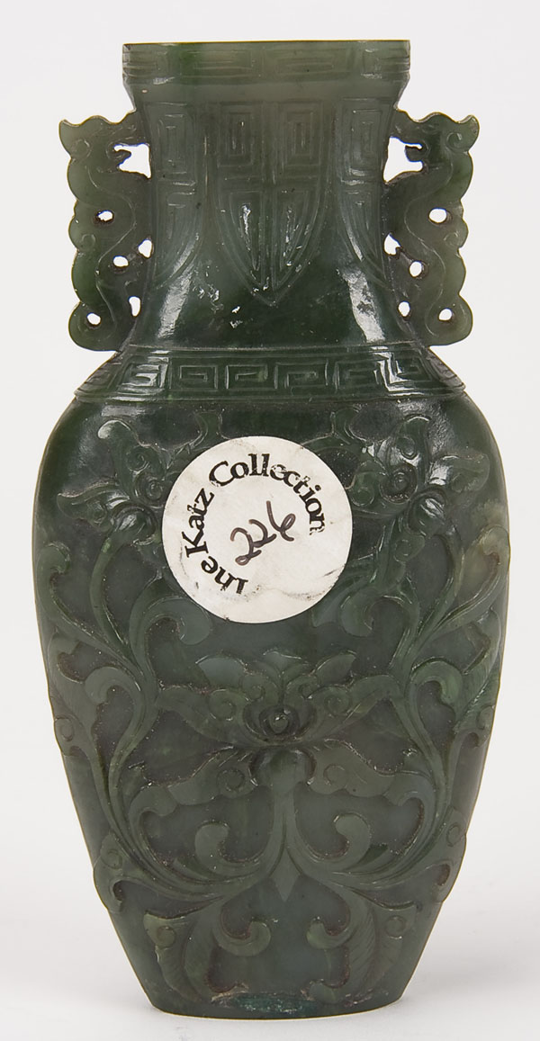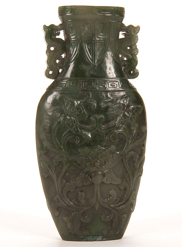 A CHINESE CARVED JADE VASE, MID QING DYNASTY. Hu form with scrolling florals and dragon form handles carved in Manasi nephrite. Height 5.25 inches (13.5 cm).