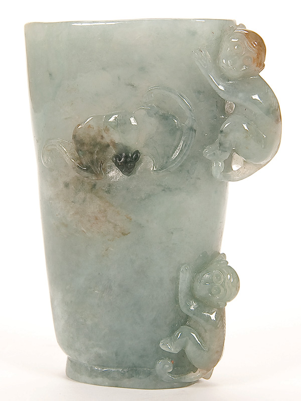 A CHINESE CARVED JADE LIBATION CUP, EARLY REPUBLIC PERIOD. With carved monkeys and bats in green and white nephrite. Height 4 inches.