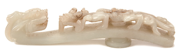 A FINE CHINESE CARVED WHITE JADE BELT HOOK, LATE QING/EARLY REPUBLIC PERIOD. Carved with a dragon head and pierced dragonet in pale green nephrite. Length 5 inches (12.5 cm).