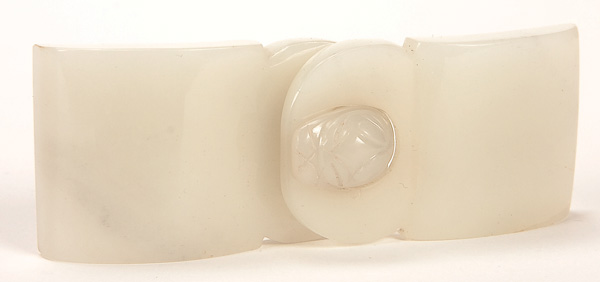 A CHINESE CARVED WHITE JADE BELT HOOK AND BUCKLE, QING DYNASTY. With carved dragon head in white nephrite. Length 3.75 inches (9.5 cm).