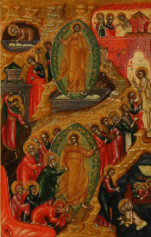 A FINE RUSSIAN PASSION ICON, PALEKH, 19TH CENTURY. Finely painted in miniature, the central panel depicting both the Resurrection (top) and the Descent into Hades (bottom) thereby reflecting both the Western and Eastern iconographical images of Easter. The borders with eight less frequently depicted images of the Passion each with corresponding inscriptions identifying the subject. From top to bottom left to right they are: The Crowning of Thorns, Christ Before Pilate, Christ Carrying the Cross, Christ Nailed to the Cross, Joseph of Arimathea Requesting the Body of Christ from Pilate, The Removal from the Cross, The Placement in the Tomb, and The Myrrh-bearing Women. Without a doubt an important Moscow or Palekh workshop. 12.25 inches x 10.25 inches (31 x 26 cm)