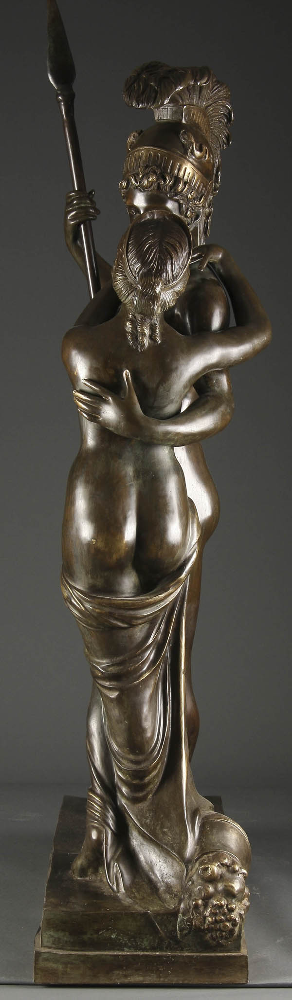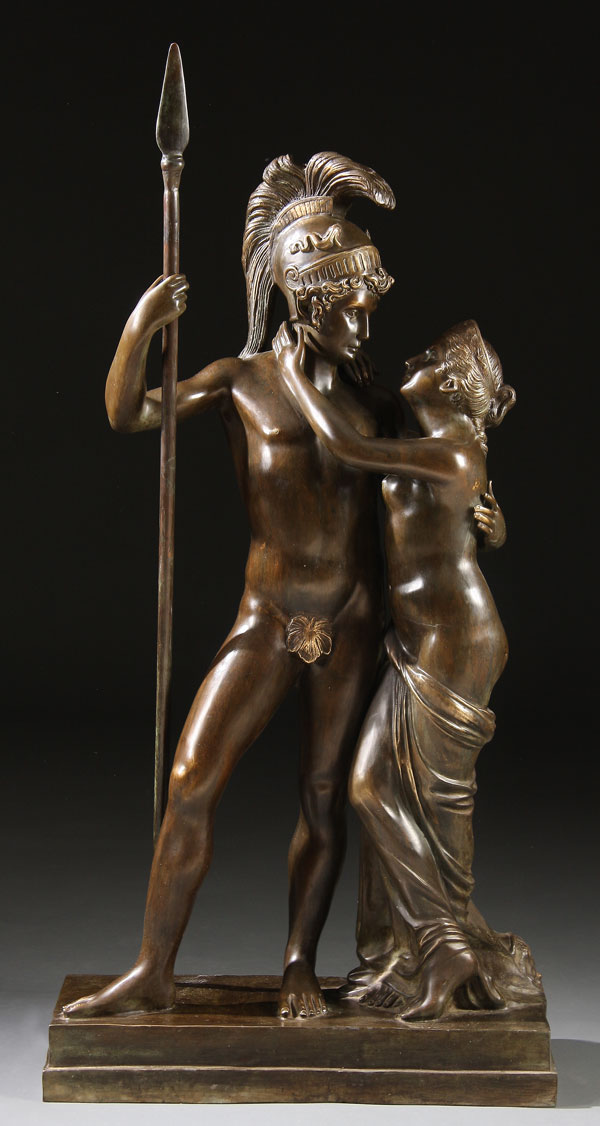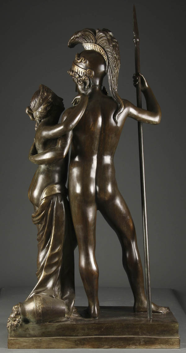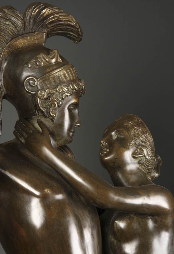 A THREE-QUARTER LIFE SIZE BRONZE OF A GRECO ROMAN WARRIOR BIDDING FAREWELL TO HIS WIFE, 20th century. Sculpted in full round with dark brown patina, apparently unsigned. Height 51 inches (129.5 cm)