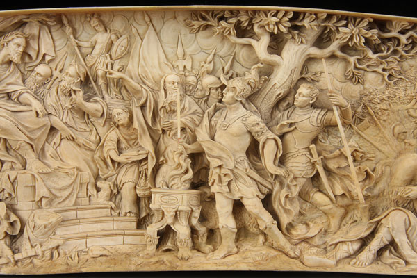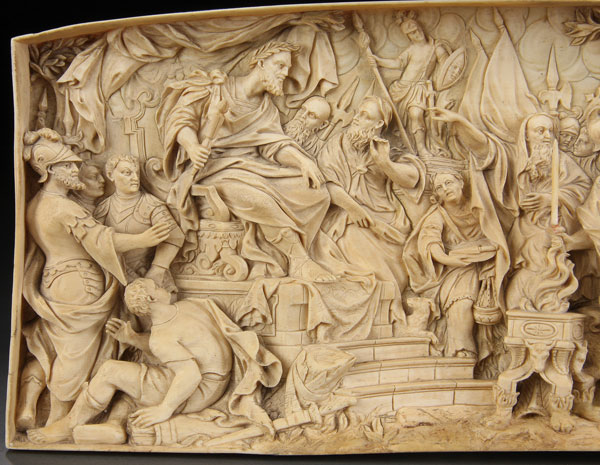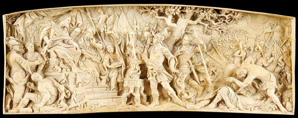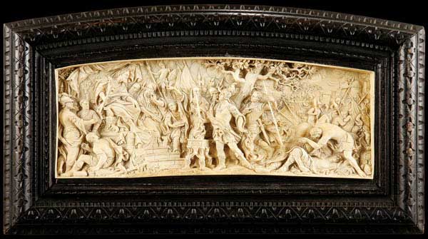 A VERY FINE SOUTH GERMAN CARVED IVORY RELIEF, workshop of Antonio Leoni, 18th century and depicting Mucius Scaevola before King Porsena. The large and impressive plaque carved in high relief with good anatomy and exceptional attention to detail. Contained in a custom fitted carved ebonized wood frame. Dimensions of carved ivory only, length 13.5 inches (34.3 cm), height 5 inches (12.5 cm).