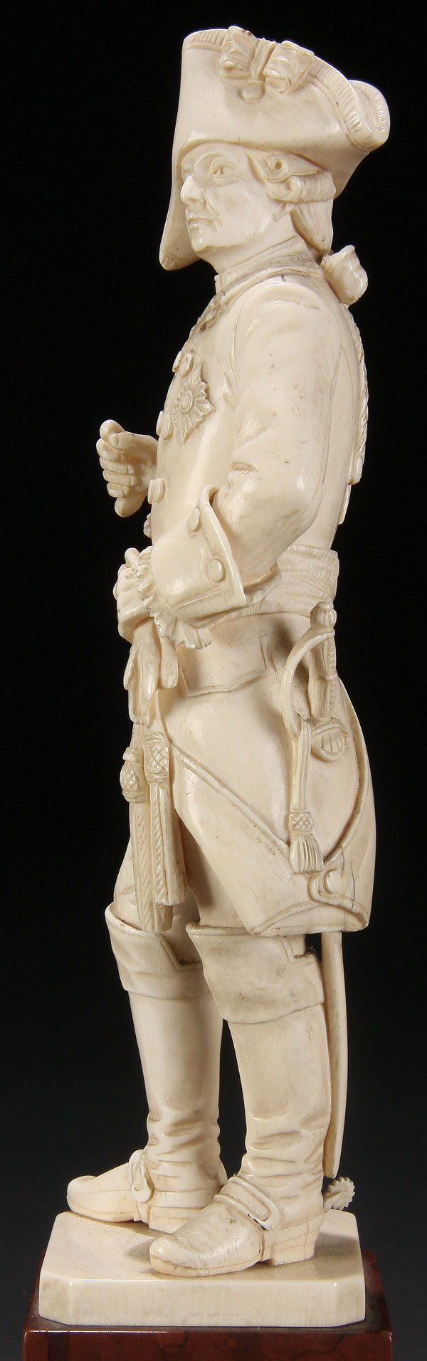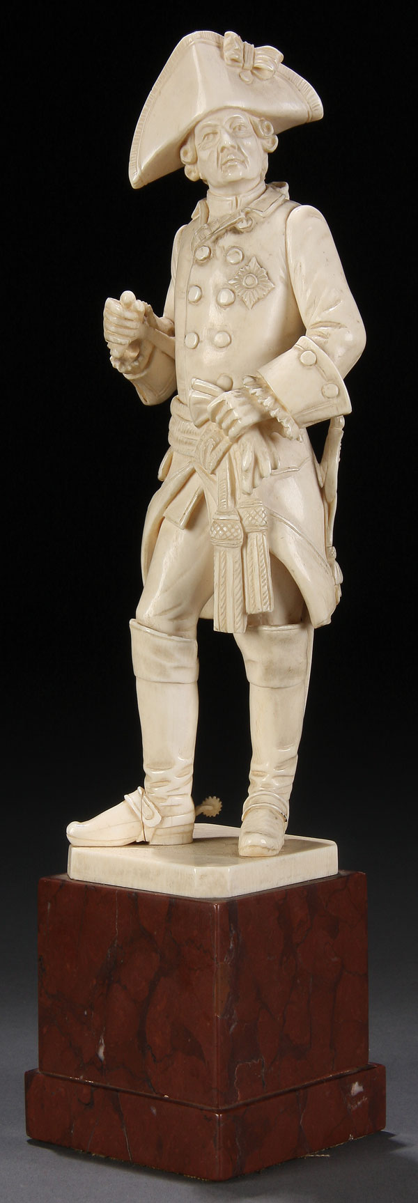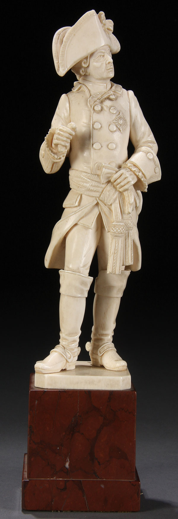 A FINE CARVED IVORY FIGURE OF FREDERICK THE GREAT, GERMAN 19TH CENTURY. Finely carved in full round with good anatomy, deep folds and overall excellent detail and resting on a polished marble base. Height (ivory only) 7.8 inches (19.5cm) Overall height including base 10.25 inches (26cm)