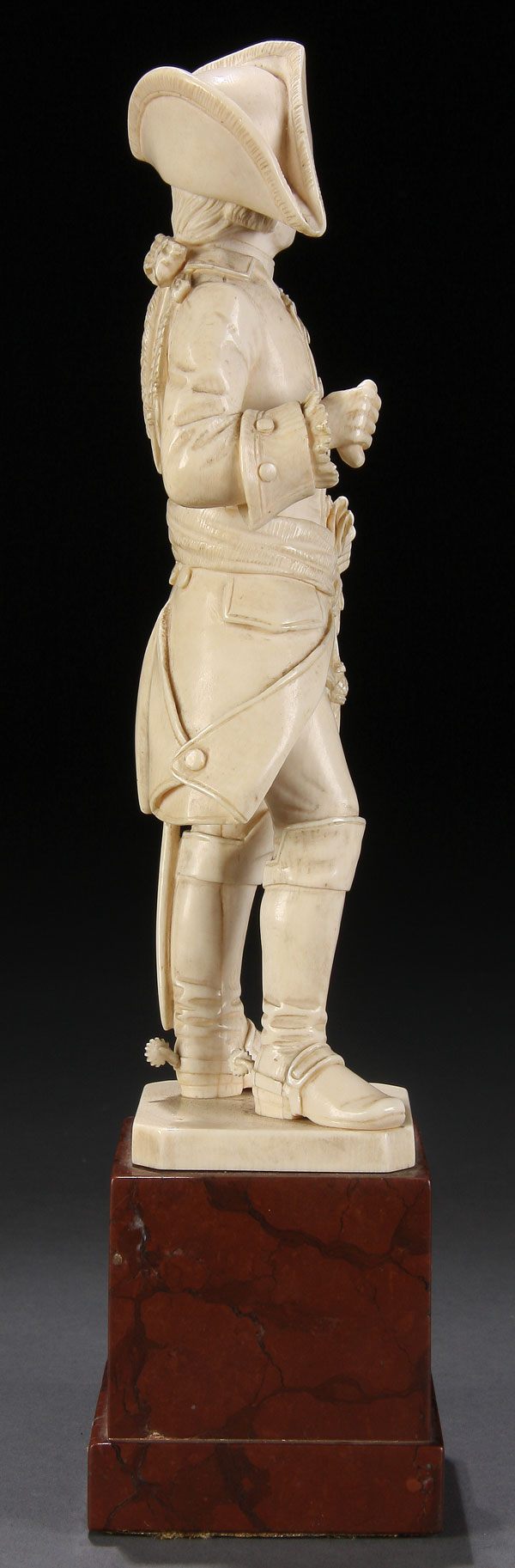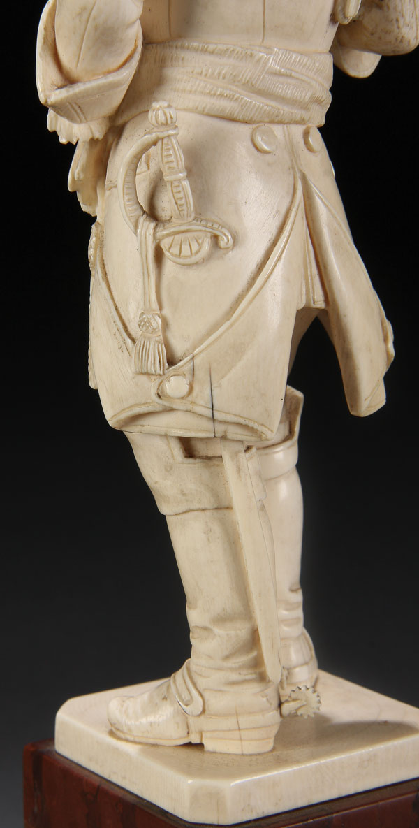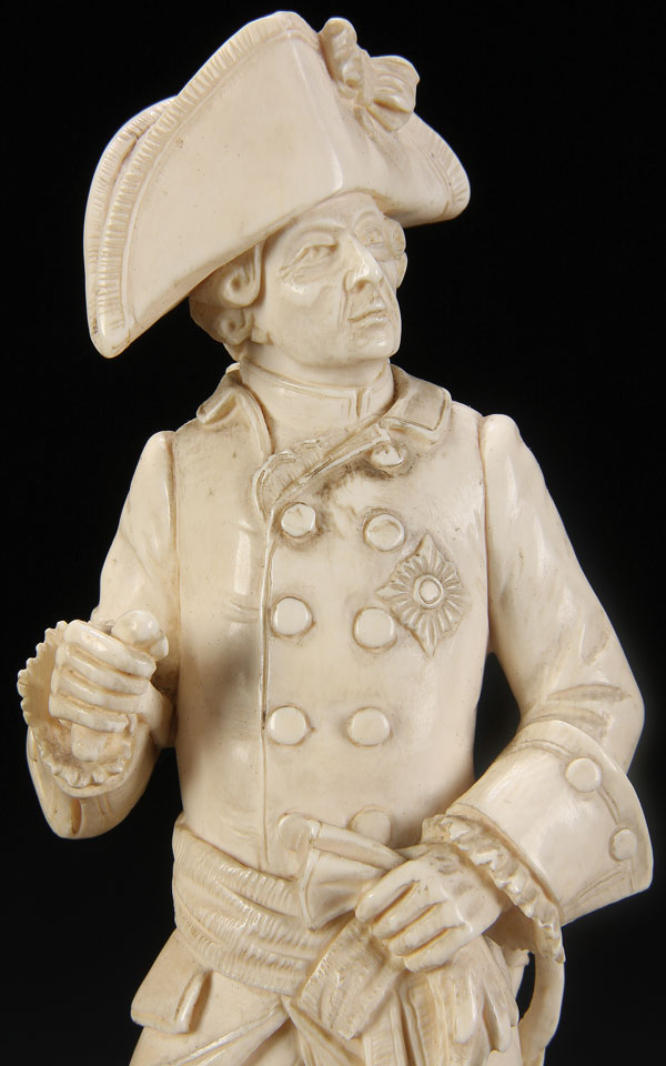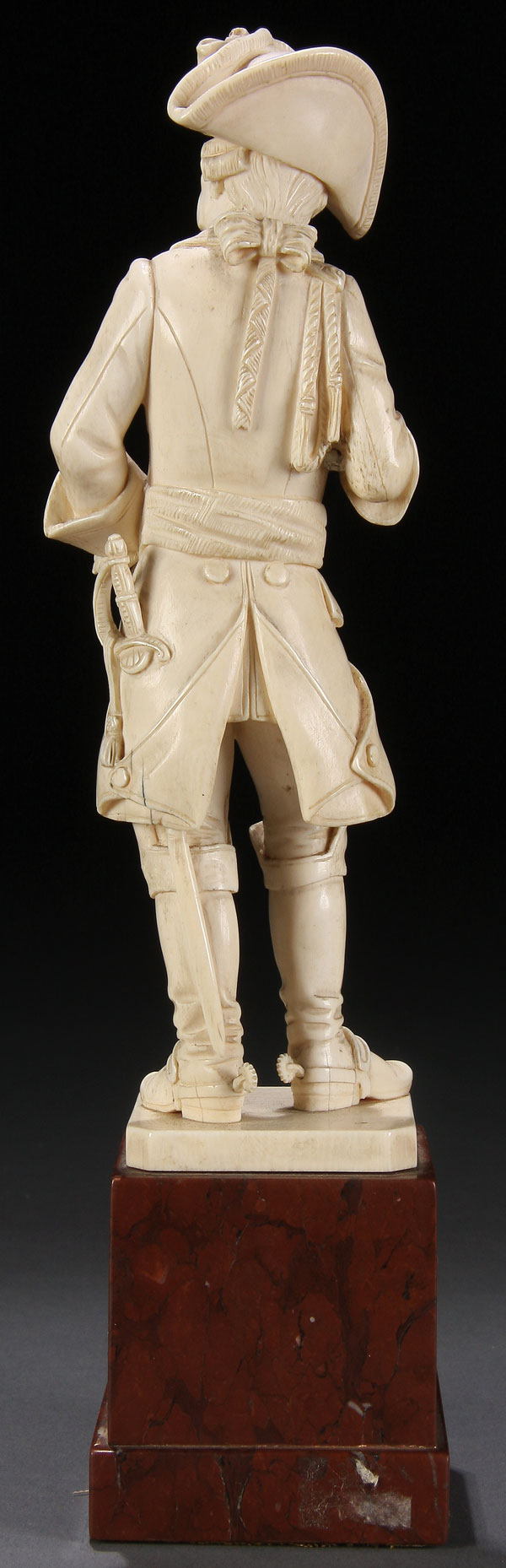 A FINE CARVED IVORY FIGURE OF FREDERICK THE GREAT, GERMAN 19TH CENTURY. Finely carved in full round with good anatomy, deep folds and overall excellent detail and resting on a polished marble base. Height (ivory only) 7.8 inches (19.5cm) Overall height including base 10.25 inches (26cm)