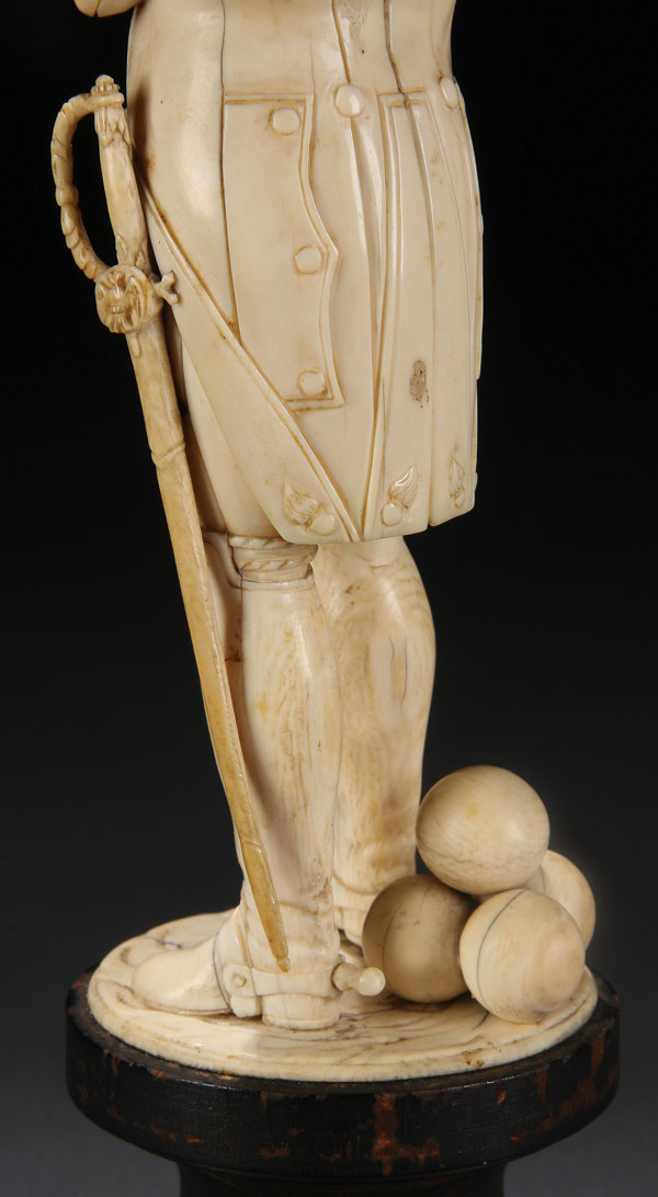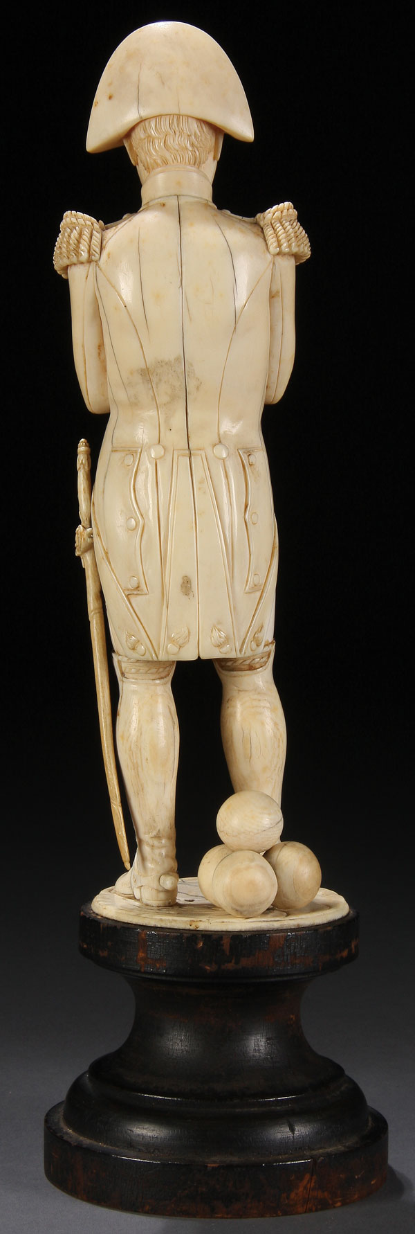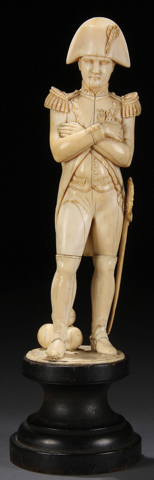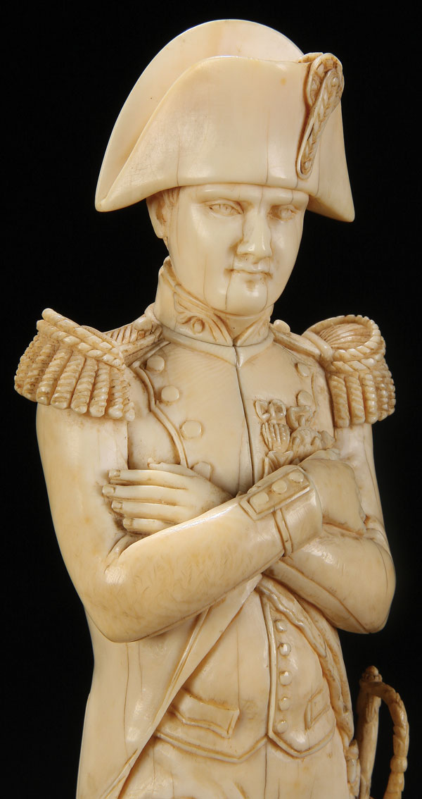 A LARGE AND IMPOSING CARVED IVORY FIGURE OF NAPOLEON, FRENCH 19TH CENTURY. Finely carved in full round with good proportions and anatomy and exceptional detail including the ornate braided shoulder boards, uniform, orders, medals, stacked cannon balls and the sword, carved with the Imperial Eagle on the hilt. Set on a turned stained wood plinth. Carved ivory figure 9.5 inches (24 cm) overall height including base 12.3 inches (31 cm). This figure of Napoleon, with crossed arms, was most likely inspired by the painting of a similar subject entitled Napoleon Bonaparte Musing at St. Helena (1830) by Benjamin Robert Haydon (1786-1846), a version of which is presently in the collection of the National Portrait Gallery in London, England. Napoleon was exiled to the island of St. Helena in 1815.