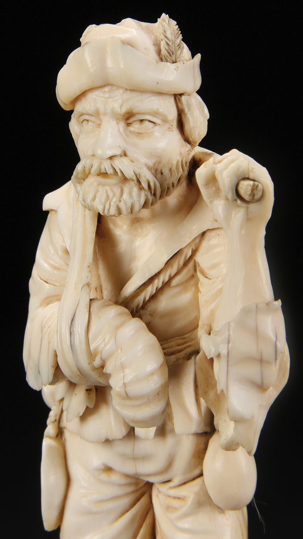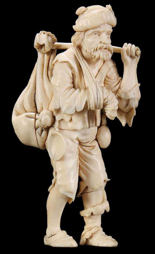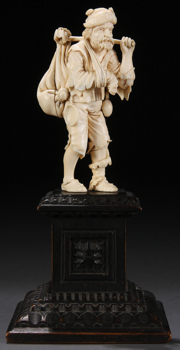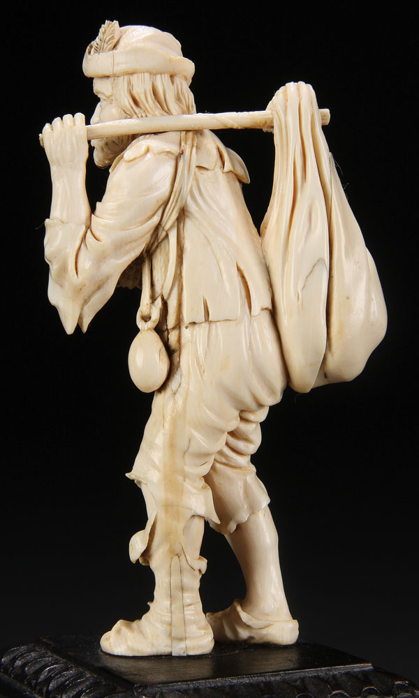 A FINE GERMAN CARVED IVORY FIGURE OF A BEGGER, 18TH CENTURY. Finely carved with great detail, carved tattered clothing, deep folds and dramatic expression. Mounted on probably the original carved and stained wood plinth. Carved ivory figure 4.75 inches (12 cm) Overall height with base 8.5 inches (21.5 cm)