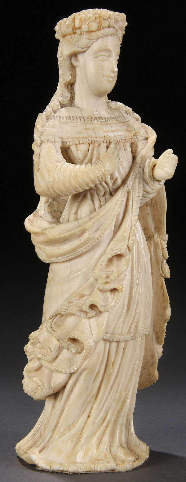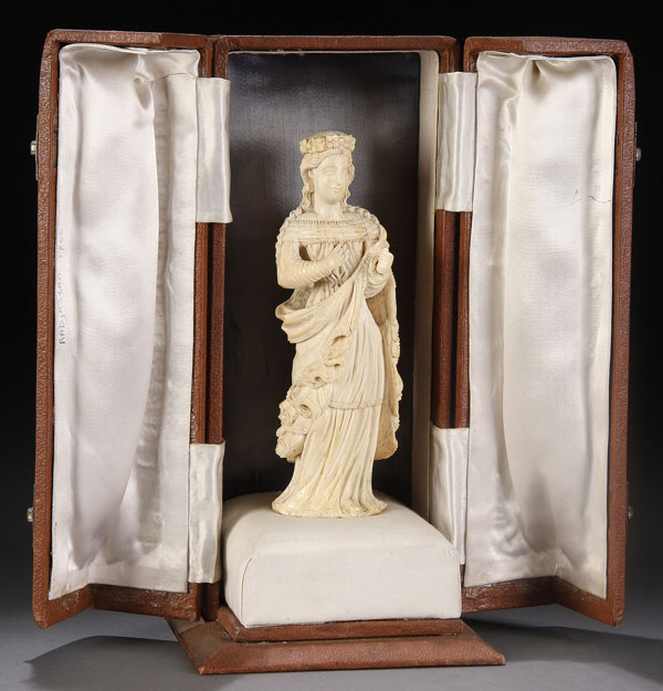 A CARVED IVORY FIGURE OF THE VIRGIN, GOANESE, 18TH CENTURY. Carved in full round with cascading hair and deep folds. Together with a custom fitted, silk lined leather case. Height 7 inches (18 cm)