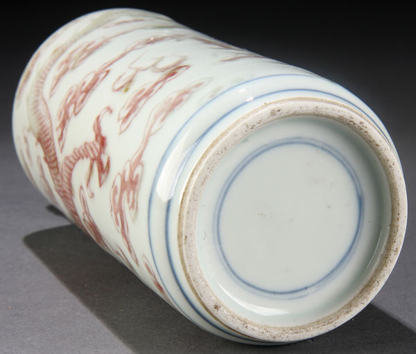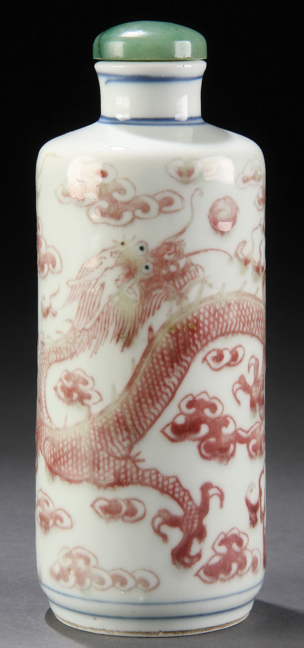 A CHINESE KANGXI STYLE COPPER OXIDE DRAGON DECORATED SNUFF BOTTLE, LATE QING/EARLY REPUBLIC PERIOD. With underglaze red dragon and cloud forms surmounted with a jadeite stopper. The bottom with circular blue underglaze mark. Height 6 inches (15 cm).