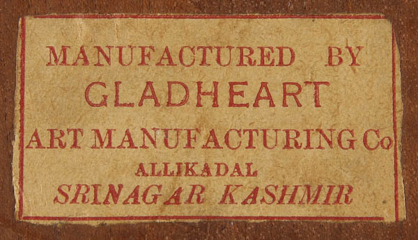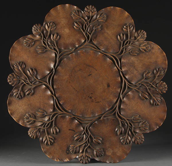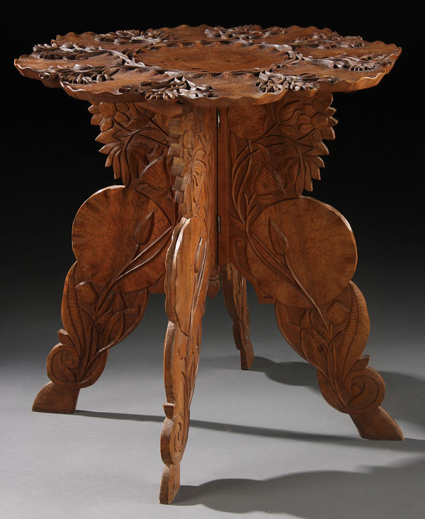 A SINO-TIBETAN “GLADHEART” CARVED MAHOGANY LOW TABLE, 20TH CENTURY. The deeply carved relief and scalloped top carved as a composite of nine rosettes with convoluted blossoms and branches fitted to a folding four legged stand with matching decoration. Affixed paper label “Manufactured by Gladheart art manufacturing co. Allikadal, Srinagar, Kashmir” (India). Height 25 inches (63 cm), diameter 23.25 inches (59 cm).