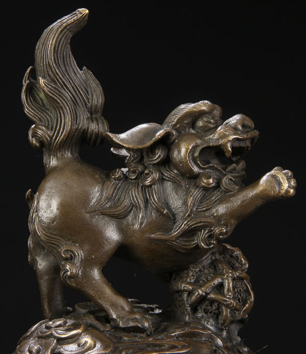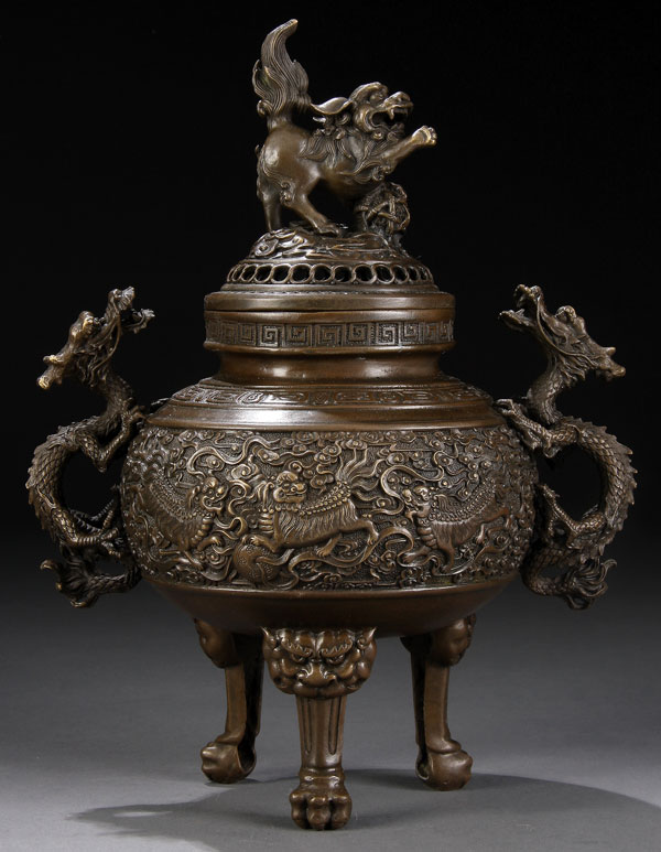 A CHINESE PATINATED BRONZE TRIPOD CENSOR, 20TH CENTURY, of squat bulbous form raised on three claw footed legs finely embossed with scenes of foo dogs on a cloud form ground flanked by two figural dragon handles and surmounted by a pierced dome cover with figural foo dog finial. Embossed pseudo seal mark on base. Height 13.5 inches (34 cm).