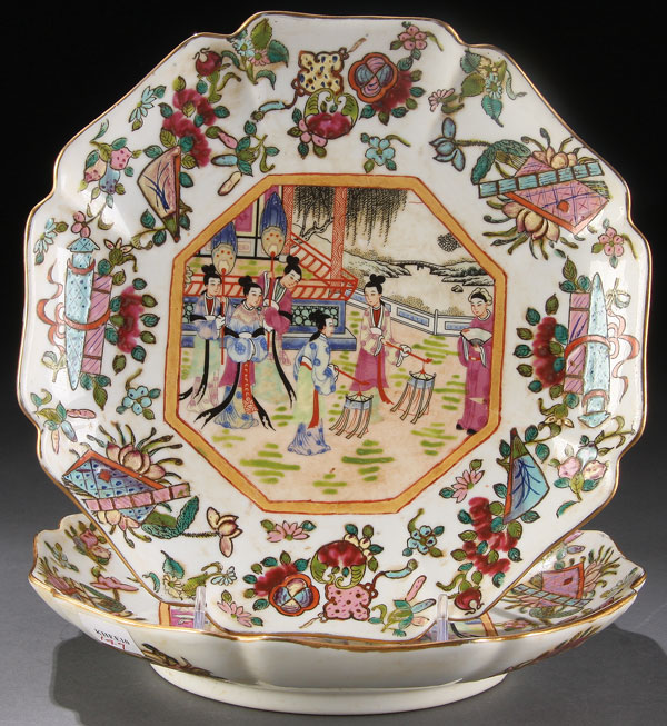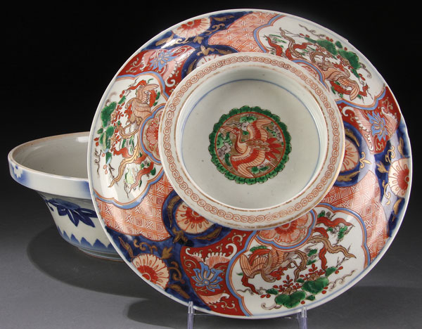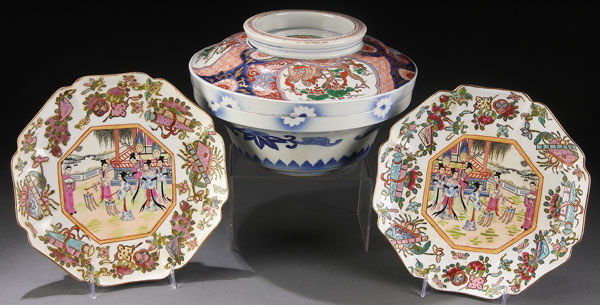 A 3-PIECE ORIENTAL PORCELAIN GROUP, 19TH/20TH CENTURY. Consisting of a lidded Imari bowl with hand painted phoenix decoration and 2 matching Famille Rose octagonal plates with garden scenes. The plates with reign marks. Diameter 10 inches (25.4 cm).