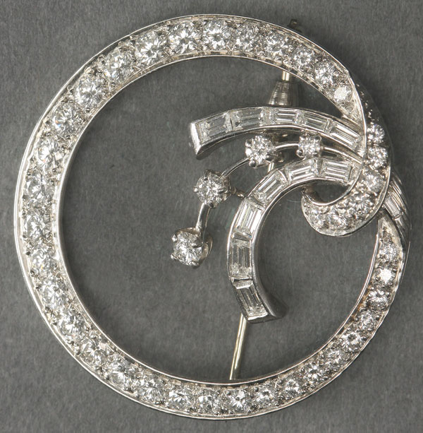 A FINE DIAMOND BROOCH, MID 20TH CENTURY. Of circular form containing approximately 52 brilliant round and baguette cut diamonds set in a stylized wreath form of unmarked white gold or platinum for a total carat weight of approximately 2.5 KT, the diamonds of VS quality or better and of good white color; ranging from approximately 1/8 KT to 1/32 KT each. Diameter 1.5 inches (3.5 cm).