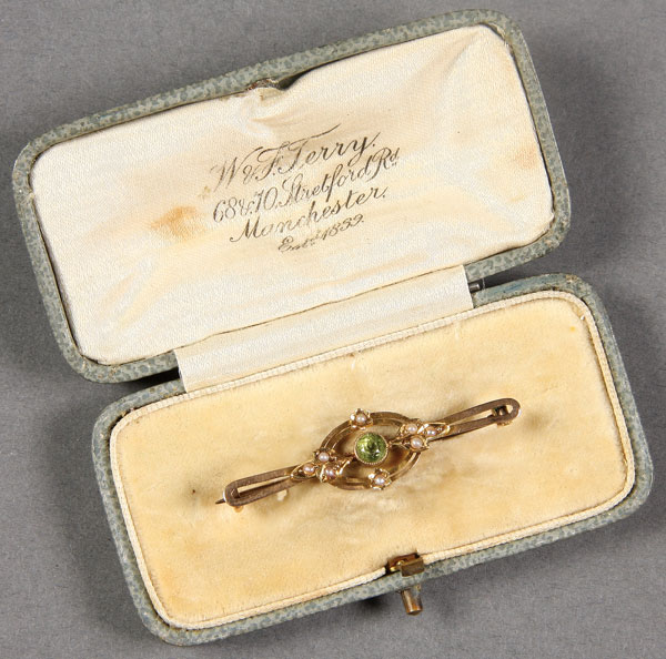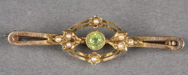 A FINE VICTORIAN GOLD DEMANTOID GARNET AND SEED PEARL BAR PIN, PROBABLY CONTINENTAL. With an approximately 4 mm round cut demantoid green garnet and 8 approximately 1mm seed pearls. Length 1.75 inches (4.5 cm). Indistinguishable hallmarks, contained in a WF Terry English retailer's box.