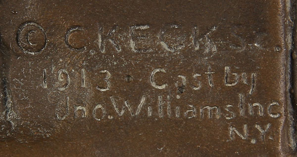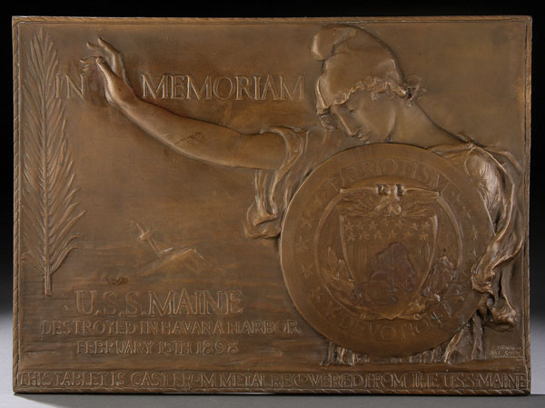 A U.S.S. MAINE BRONZE MEMORIAL PLAQUE commemorating the destruction of the U.S.S. Maine. Designed by American sculptor, Charles Keck (American 1875-1951) in 1913 and cast by John Williams Foundry in New York. The tablet depicts Columbia holding a shield of patriotism with text "In Memoriam USS Maine Destroyed in Havana Harbor February 15, 1898 This Tablet is Cast From Metal Recovered From the USS Maine". 13 inches x 17.5 inches