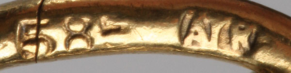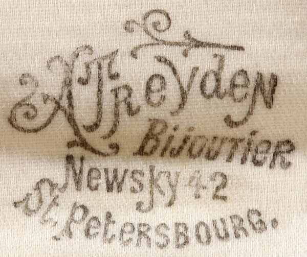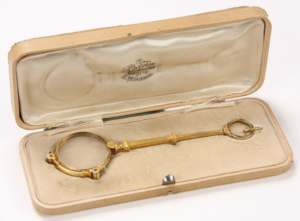A FINE 14K GOLD CASED LORGNETTE, CIRCA 1900. The expanding fluted column with acanthus leaf finial supporting the spring hinged lens release and the rims chased with a husk motif. Suspension loop stamped with the gold standard 585 (14K) and with the initials ATR presumably for A Treyden, the jeweler whose name appears stamped on the silk lining of the custom fitted case, “A.Treyden Bijoutier Newsky 42-St. Petersbourg”. Length 5.6 inches (14.3 cm)
