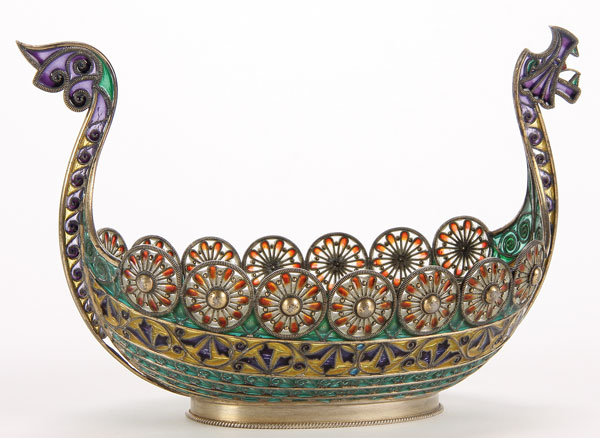 A VERY FINE SILVER-GILT AND PLIQUE-A-JOUR ENAMEL VIKING BOAT, PROBABLY MARIUS HAMMER, CIRCA 1900. The prow modeled with a dragons head with open mouth, the rim with shields and the interior of the raised oval foot also enameled. Stamped with indistinguishable makers mark, 925S and with Swedish import marks (three crowns). Length 6 inches (15.4cm)
