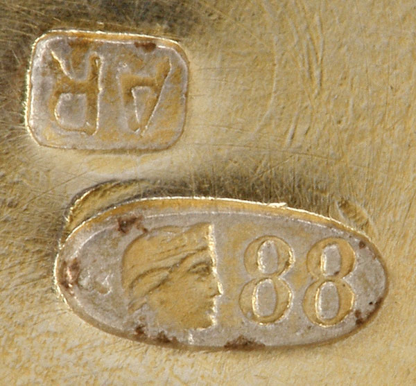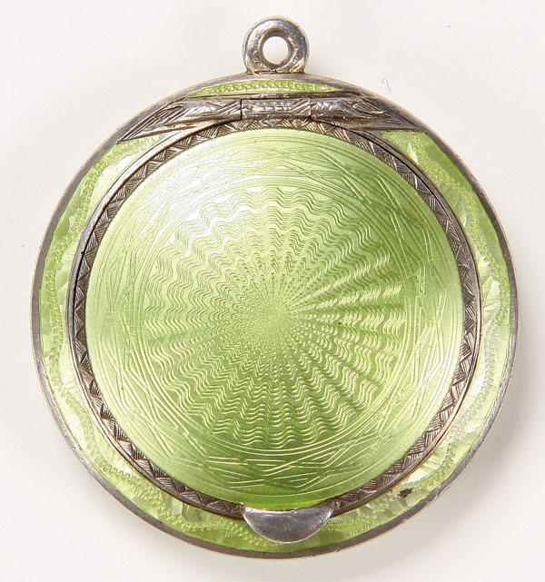 A FABERGE SILVER-GILT & GUILLOCHE ENAMELED LOCKET-STYLE COMPACT, ST. PETERSBURG, 1908-1917. The circular domed case overall enameled in translucent moss green enamel over a wavy and sunburst guilloche ground with hinged lid with engraved banding and opening to reveal a gilt interior with mirror. Hallmarked St. Petersburg, 88 standard and workmasters initials in Latin A.R. Diameter 1.75 inches (4.6 cm)