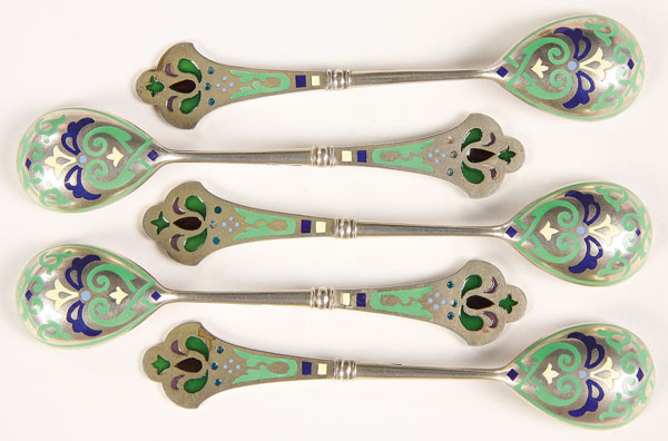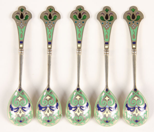 A SET OF RUSSIAN SILVER AND ENAMEL DEMITASSE SPOONS, 11TH ARTEL, MOSCOW, 1908-1917. The back of bowls and handles in champlevé enamel and the finials with translucent (plique-a-jour) enameled elements. Hallmarked Moscow, 1908-1917, makers mark 11A for the 11th Artel and 84 silver standard. Length 4.25 inches (10.6 cm)