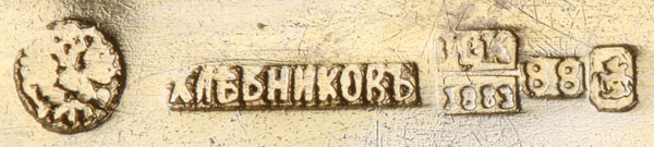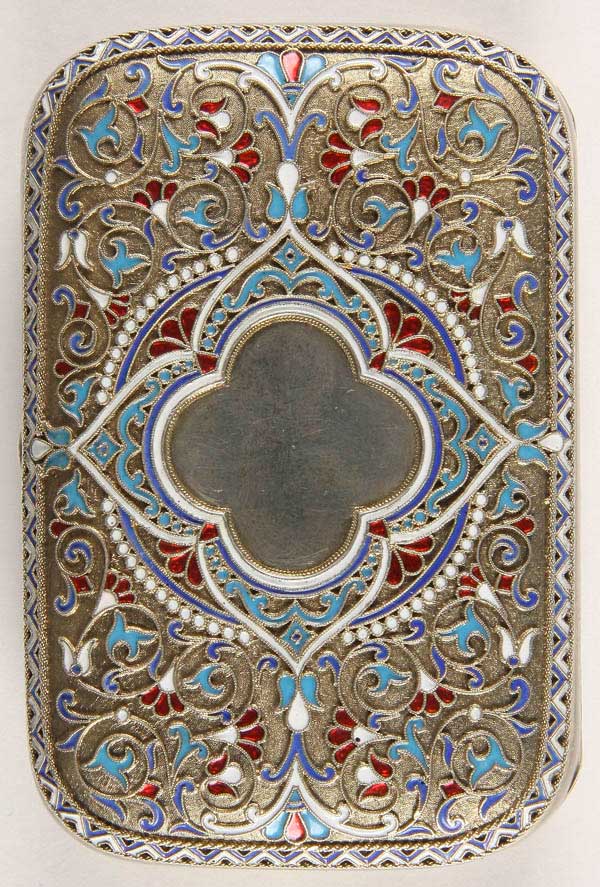 A RUSSIAN SILVER GILT AND CLOISONNÉ ENAMEL CIGARETTE CASE, KHLEBNIKOV, MOSCOW, 1883. The lid enameled with central medallion, scrolling foliate and geometric border on a stippled gilt ground. Verso similarly enameled with a polished quatrefoil central medallion. Pushbutton thumbpiece opening to reveal a gilded interior, hallmarked Moscow, dated 1883, Cyrillic maker’s mark of Khlebnikov with Imperial Warrant and 88 standard. Length 4 inches (10.2 cm).
