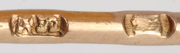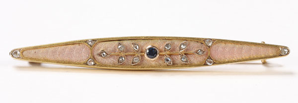 A RUSSIAN GOLD GEMSET AND ENAMEL BROOCH, CIRCA 1900. The flattened oval gold frame tapering at both ends set with translucent peach colored enamel over engraved scale pattern and embellished with diamond studded floral form with faceted blue gemstone. Verso with gold folding pin stamped with makers initials AH and with indistinguishable city mark. Length 2.5 inches (6.4 cm)
