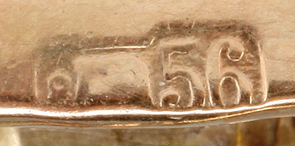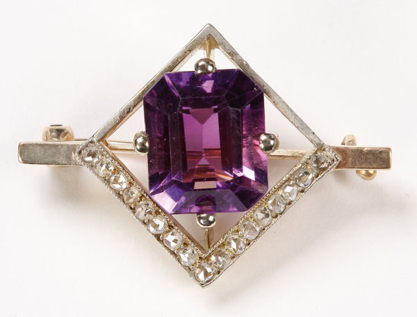 A RUSSIAN GOLD AMETHYST & DIAMOND BROOCH, ST. PETERSBURG, 1908-1917. The gold diamond shaped open frame holding a large cut amethyst and below a trail of diamonds. Verso hallmarked St. Petersburg, 56 gold standard (14Kt) and indistinguishable makers mark. Length 1.2 inches (2.8cm)