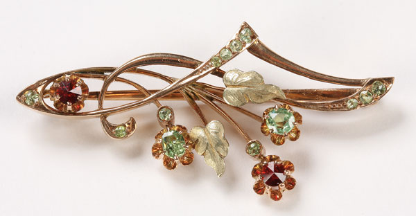 A RUSSIAN GOLD & GEM SET BROOCH, MOSCOW, 1908-1917. The open floral form set with various colored gemstones. Verso hallmarked Moscow, 56 gold standard (14KT), and Cyrillic makers mark MB. Length 1.8 inches (4.8 cm)