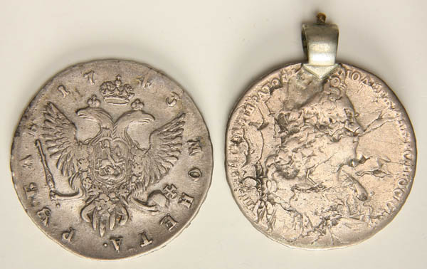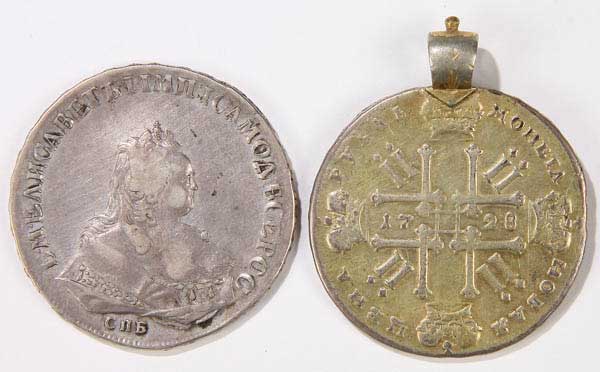 TWO 18TH CENTURY RUSSIAN SILVER RUBLES Peter II 1728, altered with suspension loop; an Elizabeth I 1743, bust right/eagle and date. Together with a Maria Theresa restrike silver thaler.