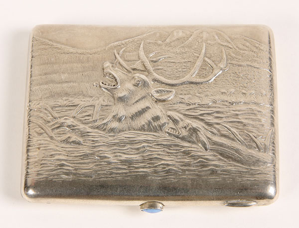 A RUSSIAN SILVER CIGARETTE CASE, MOSCOW, 1908-1917. The hinged lid finely sculpted with a scene of a dog in pursuit of an elk crossing a river with blue almond-shaped thumbpiece opening to reveal a gilt interior. Stamped with a makers mark CMK, Moscow hallmark for 1907-1918 and 84 silver standard and verso with small dedicatory inscription. Length 4 inches (10.2 cm).