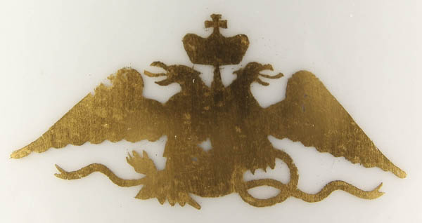A RUSSIAN GILT DECORATED PORCELAIN TEA SERVICE, CIRCA 1830. Comprising a teapot, milk pitcher, covered sugar bowl, and four matching cups and saucers. Each with gilt decorated rims and borders and with the old style Russian Imperial double headed eagle beneath a crown. Some pieces with indistinguishable incised mark, perhaps a Latin G for Gardner. Height of teapot 9.6 inches (24.5cm)