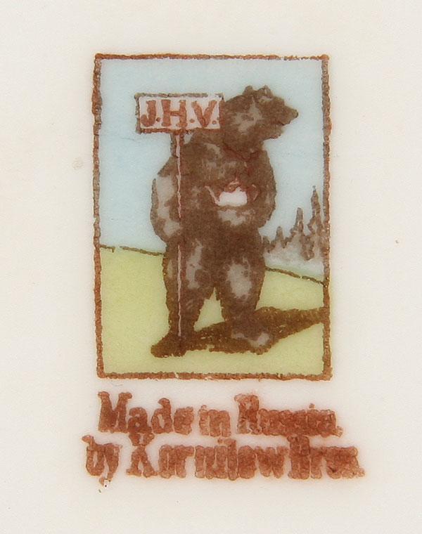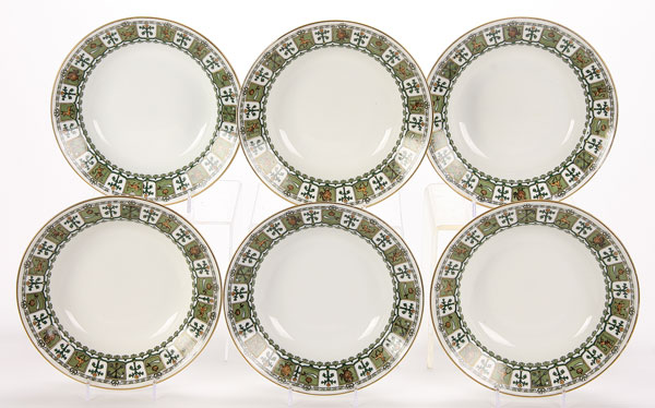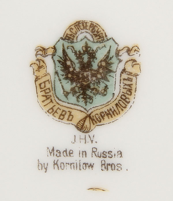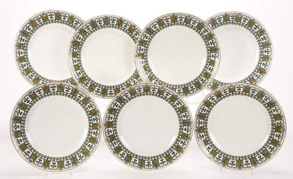 A GROUP OF THIRTEEN RUSSIAN PORCELAIN PLATES AND BOWLS, KORNILOV, CIRCA 1890. Comprising seven dinner plates, diameter 9.5 inches (24cm) and six bowls 8 inches (20cm), each with matching borders displaying various Russian city crests and with gilded rims. Undersides with factory standing bear mark of Kornilov (plates) and the bowls with the Kornilov factory mark beneath the Imperial Warrant.