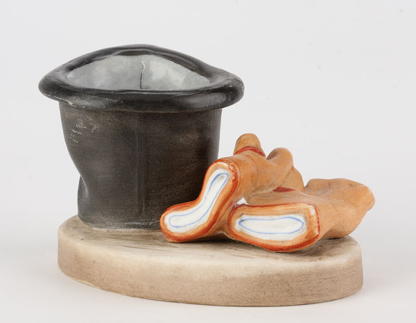 A RUSSIAN HAND PAINTED BISQUE PORCELAIN FIGURAL MATCH HOLDER, GARDNER, CIRCA 1890. Underside of base with impressed and stamped Gardner mark under the Imperial warrant. Length 5 inches (12.5 cm).
