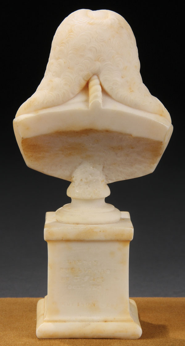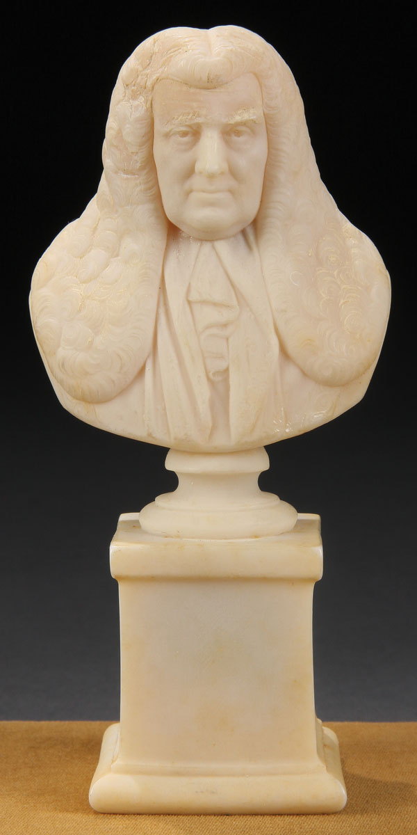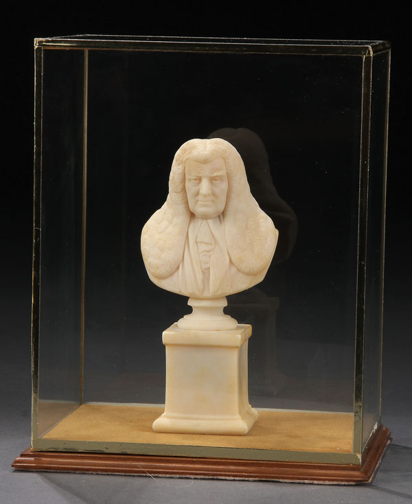 A REGENCY WAX BUST OF A MAGISTRATE, LONDON 1829. Published by Thomas Flint, sculpted by D. Morison. Height 5.5 inches (14 cm). Together with a glass display case