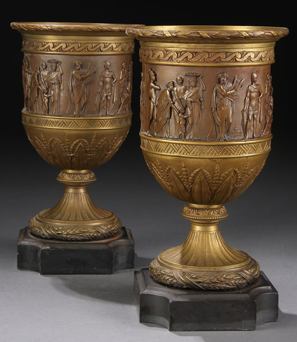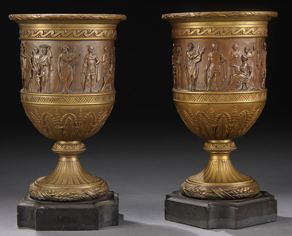 A PAIR OF FRENCH NEO-CLASSICAL GILT AND PATINATED BRONZE CASSOLETTES, LATE 19TH CENTURY. Each finely embossed with a classical frieze of Grecian warriors and dignitaries above a molded border of leaf and wheat staff raised on a fluted pedestal and shaped black slate plinth. Height 10 inches (25 cm)