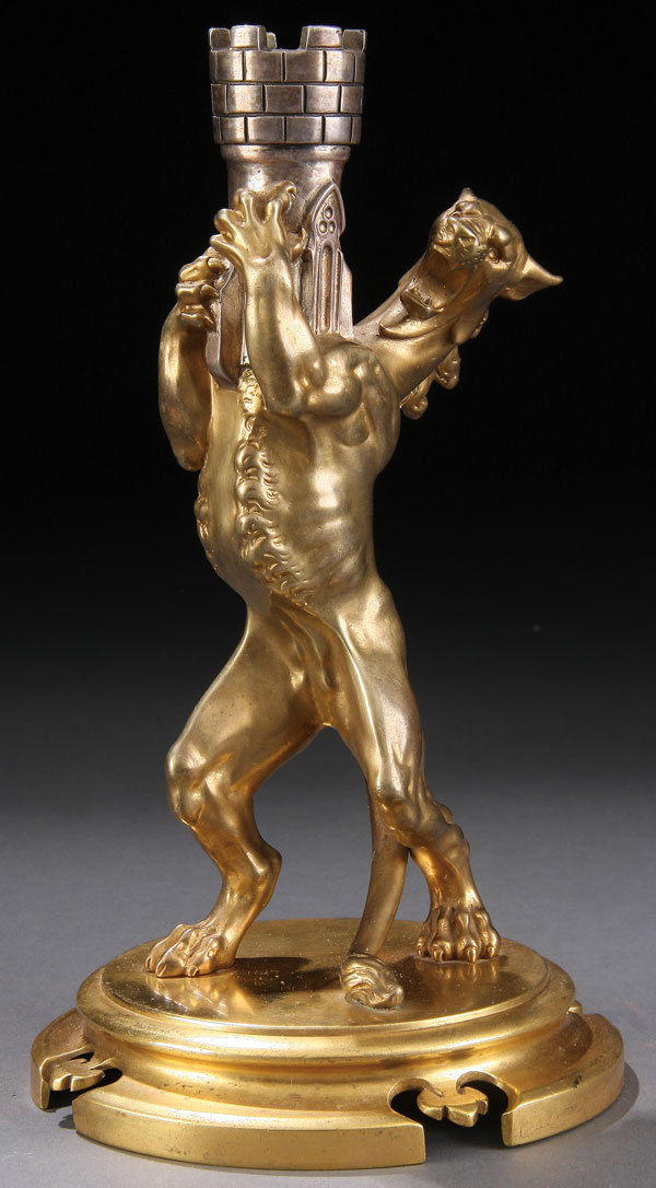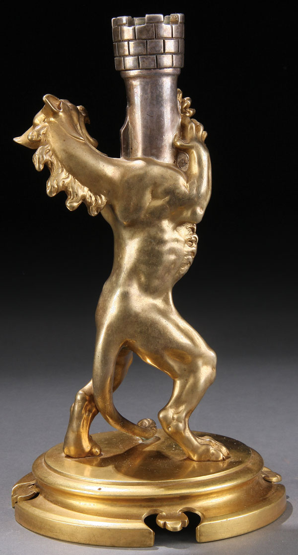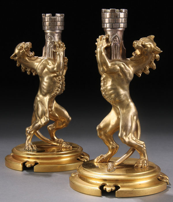 A GOOD PAIR OF FRENCH GILT AND SILVERED BRONZE RENAISSANCE REVIVAL FIGURAL CANDLESTICKS each depicting a medieval style lion supporting a castle turret form candle socket raised on a shaped circular plinth with reticulate trefoil extensions. Height 8.5 inches (21.5 cm)