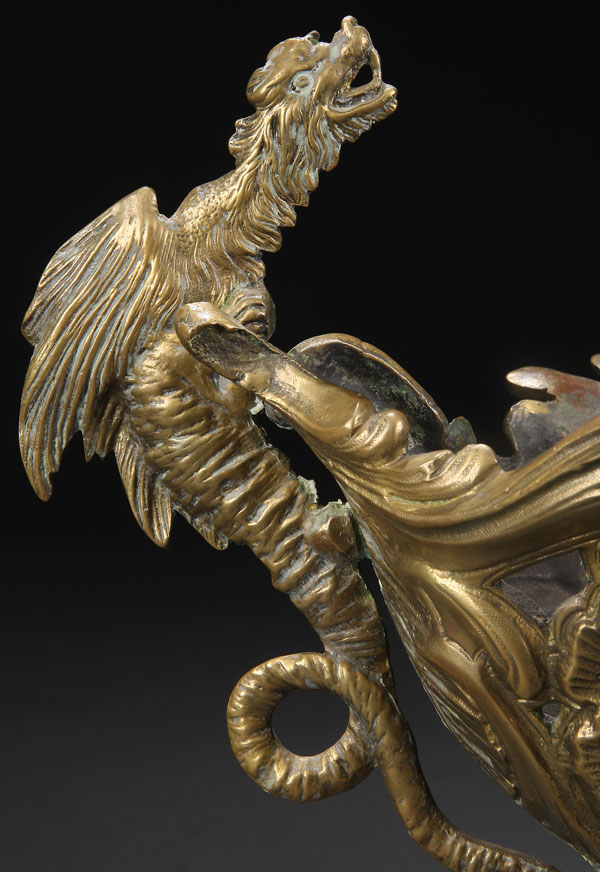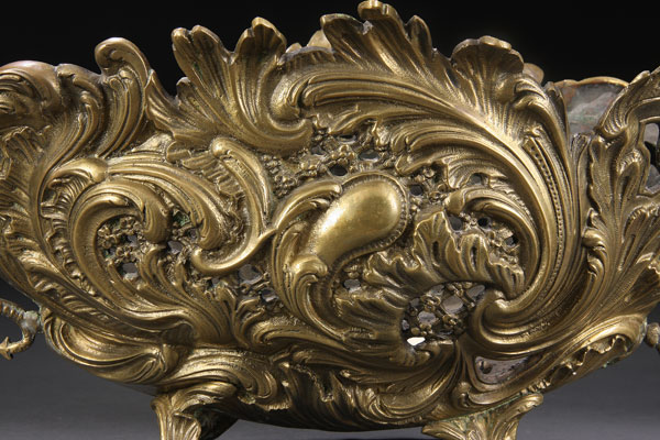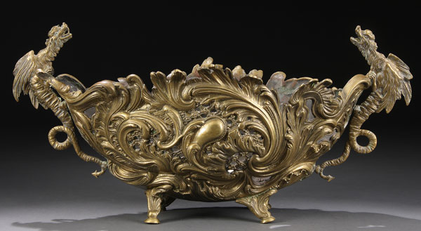 A FINE FRENCH RENAISSANCE REVIVAL BRONZE HANDLED COUPE, LATE 19TH CENTURY. Of elongated squat oval form, finely tooled and embossed with large scrolled acanthus and reticulated floral lattice flanked by winged griffin handles with elongated scrolling tails. Length 21.5 inches (53.5 cm)