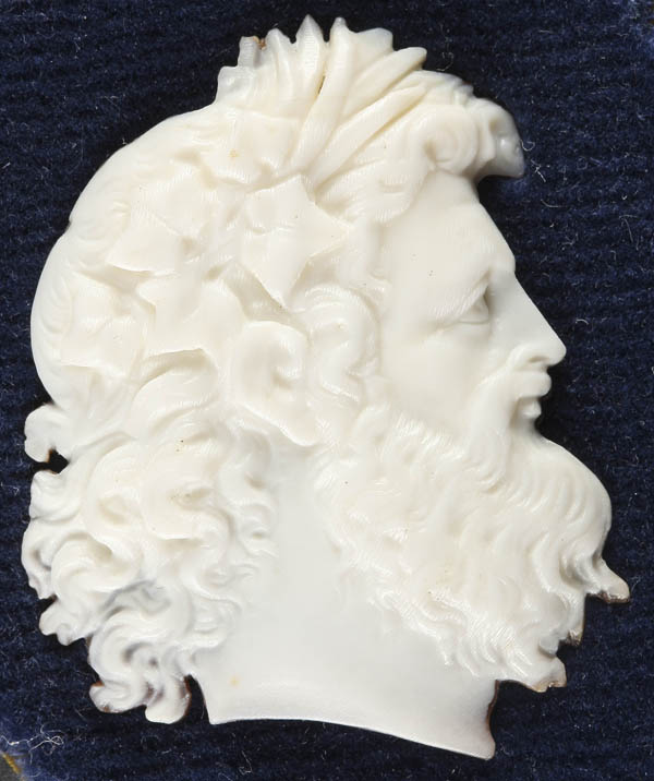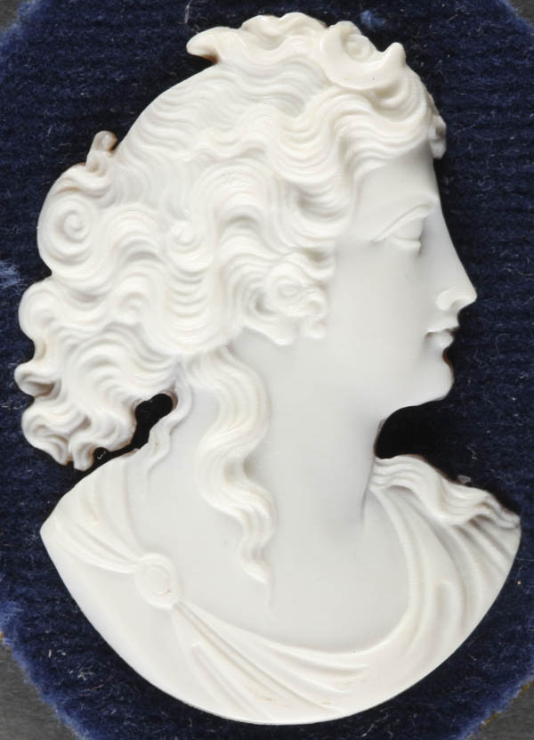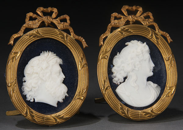 A VERY FINE PAIR OF CARVED SHELL CAMEO CLASSICAL PROFILES, CIRCA 1900. Of a man and woman extremely well carved and detailed in pure white shell and contained in matching gilt bronze free standing frames. Height 2.75 inches (7 cm)