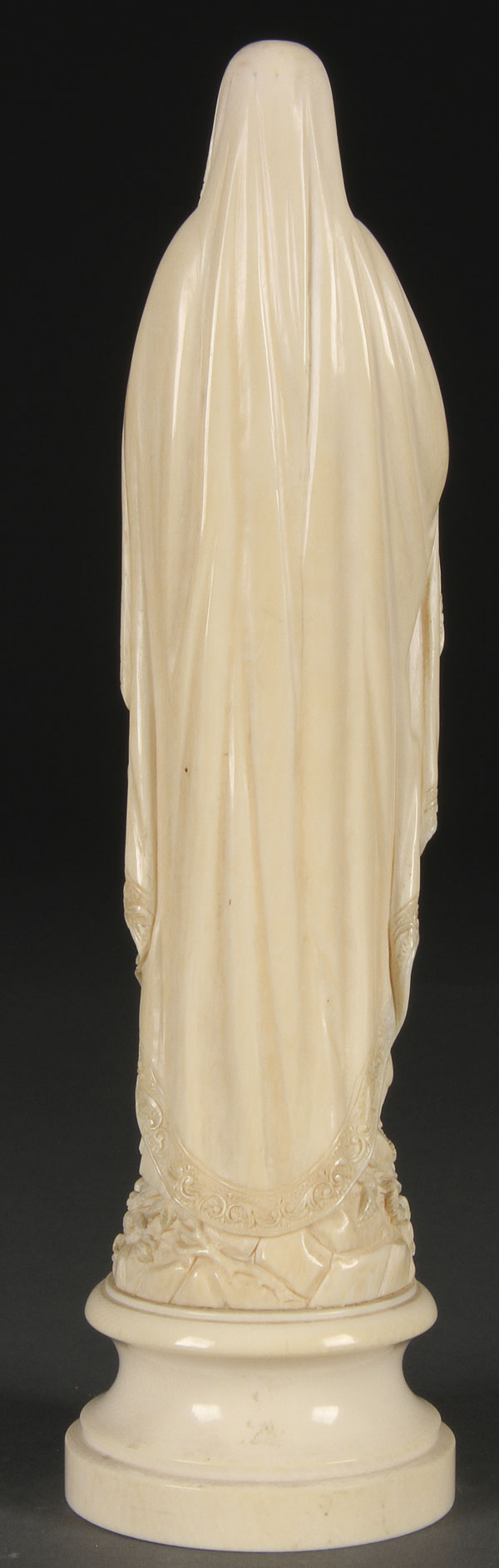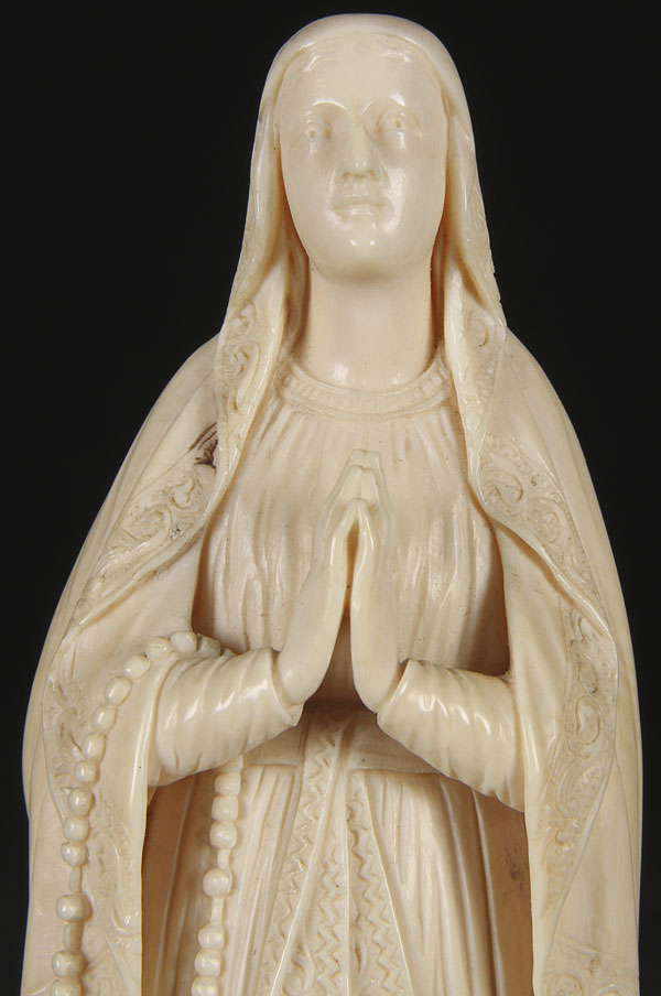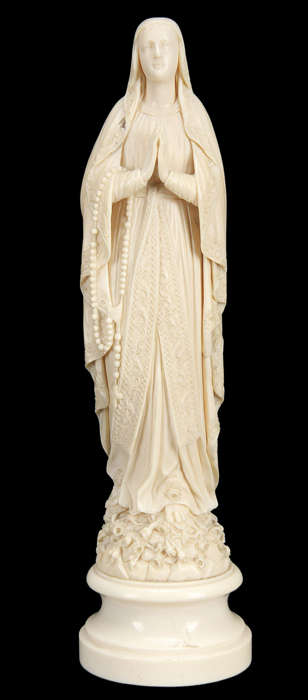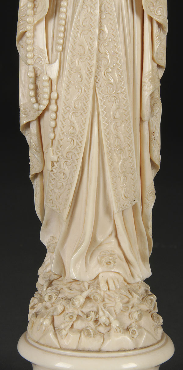 A VERY FINE LARGE CARVED IVORY FIGURE OF OUR LADY OF LOURDES, FRENCH 19TH CENTURY. Naturalistically carved in full round, with deep folds and relief carved embroidered edging and rose petals, set on a carved ivory plinth. Overall height 10 inches (25.3 cm).