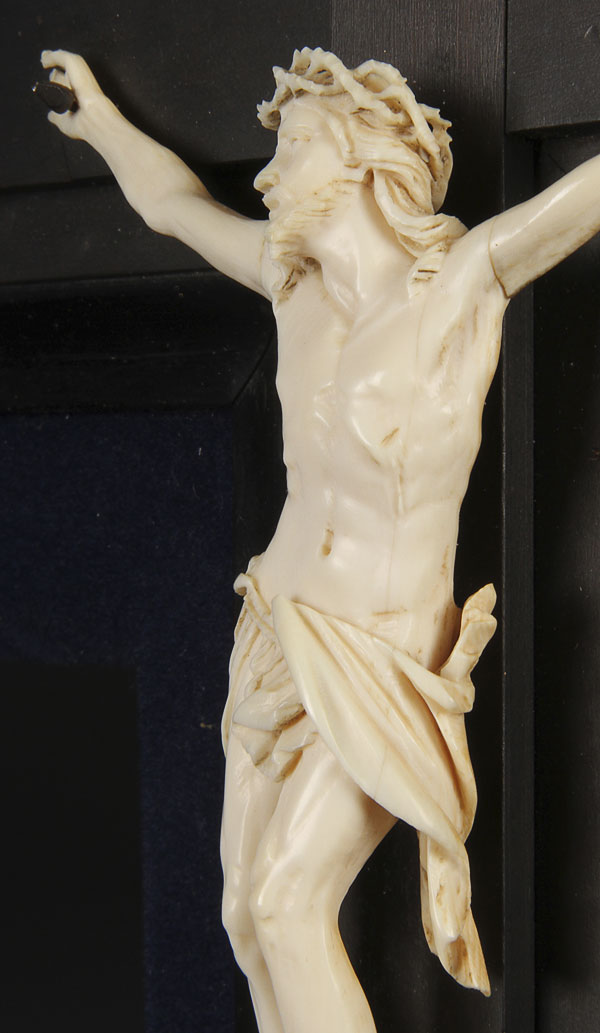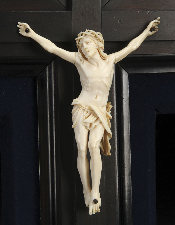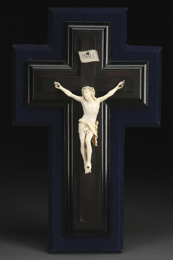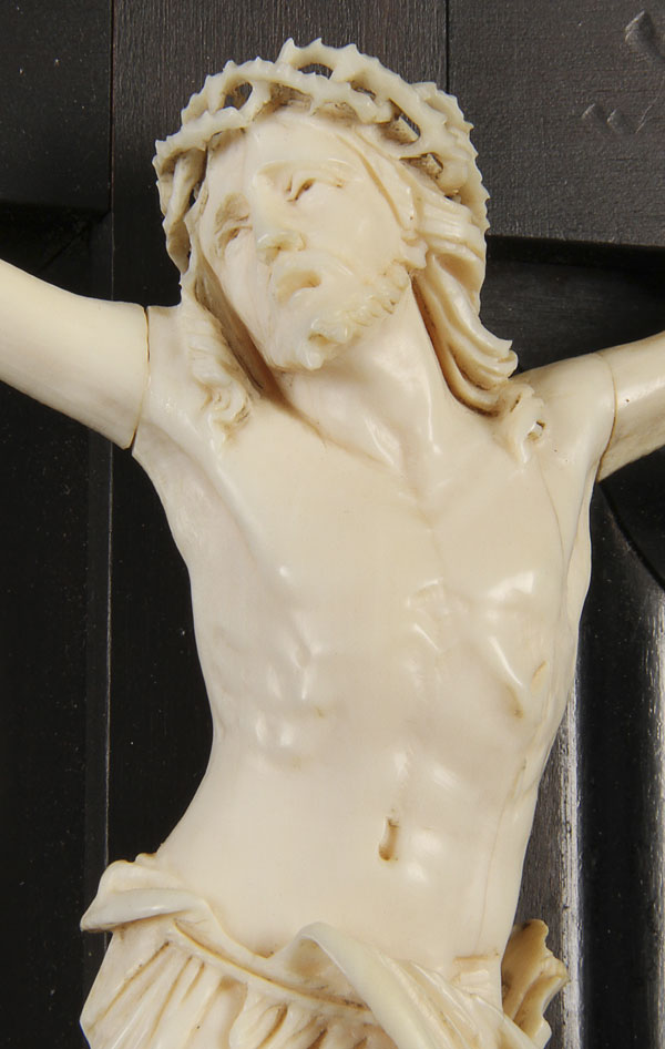 A FINE CARVED IVORY CORPUS CHRISTI, FRENCH 19TH CENTURY. Carved in full round, of good proportions and mounted on a stepped ebony wood cross with beveled edges and set on a blue felt covered mount. Overall height 16 inches (40.5 cm), Corpus 6 inches (15 cm).