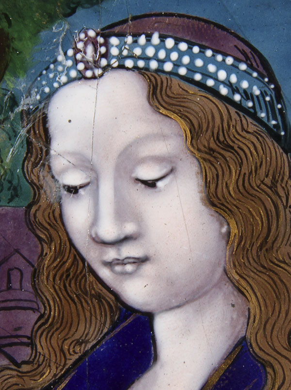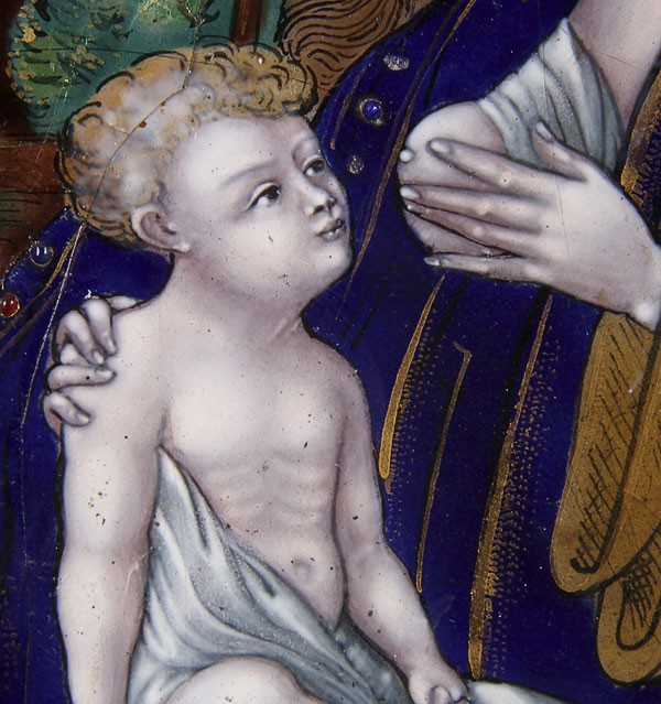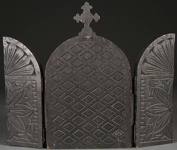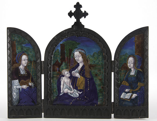 A LIMOGES ENAMELED TRIPTYCH OF THE MADONNA AND CHILD, PROBABLY 17TH CENTURY. At center, an arched copper and enameled panel depicting the nursing Virgin and the infant Christ, flanked on either side by female saints and contained in a later stained oak hinged triptych frame with cross finial. Overall 10 inches x 11.75 inches (25 x 30 cm).