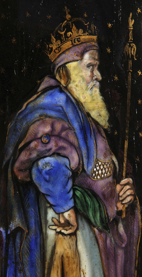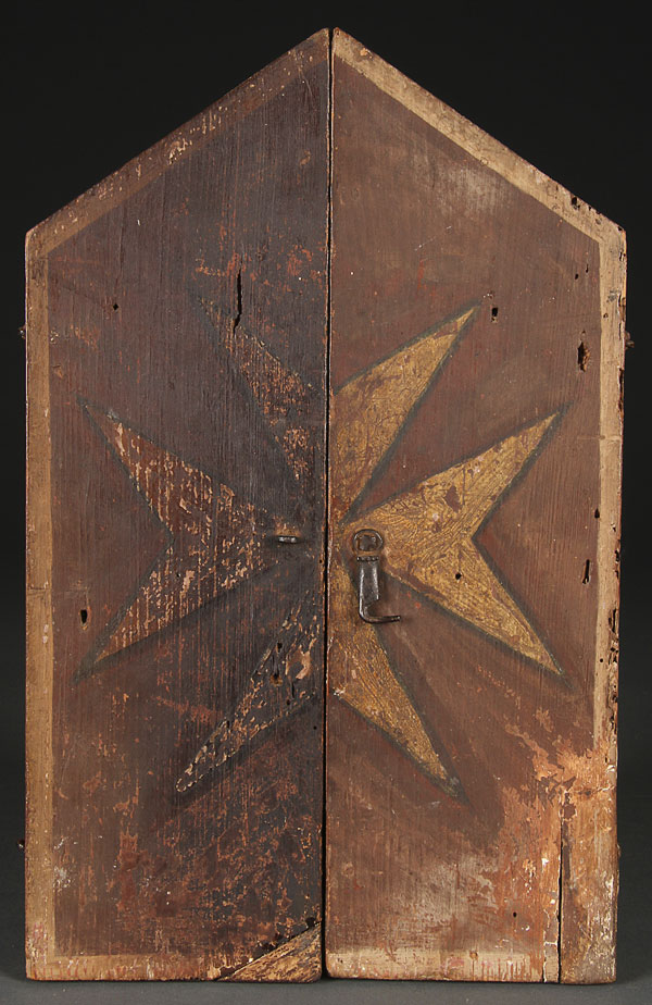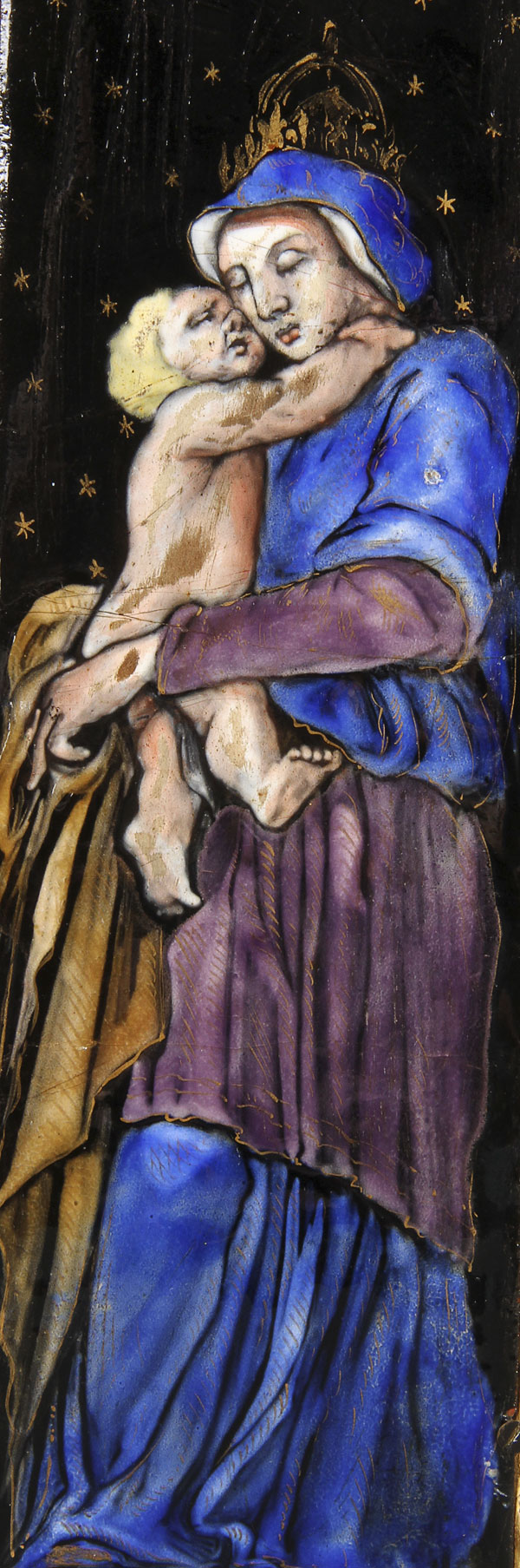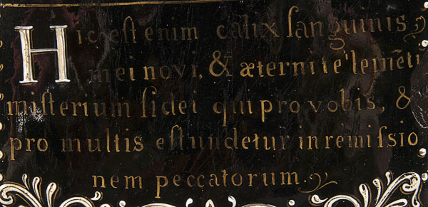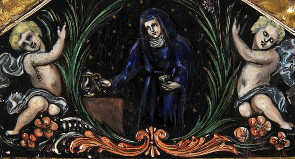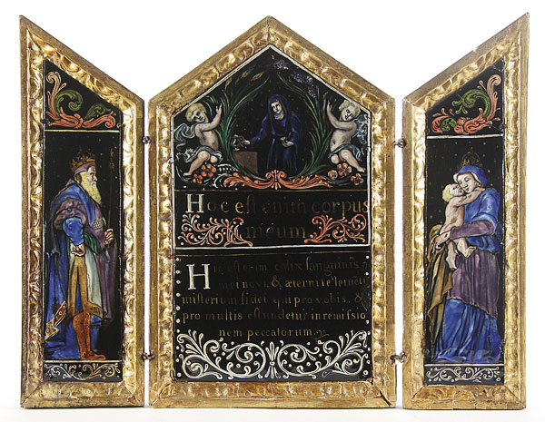 A FRENCH LIMOGES ENAMELED TRIPTYCH, 18TH CENTURY. The central arched enameled copper panel at top with Mary Magdalene, framed within a cartouche of wheat and grapes, flanked by two angels, below inscribed in gilt the Latin words of Consecration "Hoc Est Enim Corpus Meum". The left wing with the figure of a king and on the right wing, the crowned Virgin and Child. Contained in a carved gilt wood hinged triptych frame, the verso of the folding doors painted with a Maltese cross. Height 15 inches x 19.25 inches (open) 38 x 49 cm.
